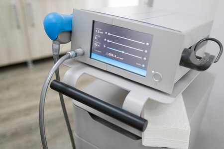 Close up view of modern device shock wave ultrasound in medical office. Physiotherapy rehabilitation and treatment