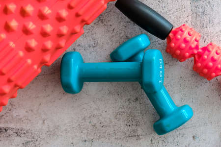 Sports background. Equipment for training. Fitness, workout at home. Flat lay, top view, copy space