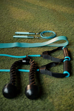 Triceps rope and various resistance bands and resistance strap on turf floor in gym