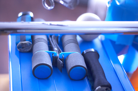 Manual training grip, dumbbells and various accessories, on a blue background. Zenith view and copy space.