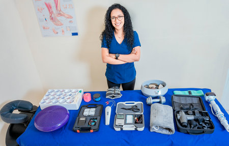 Physiotherapist woman showing therapy accessories and equipment. Physiotherapist with physiotherapy accessories. Smiling physiotherapist showing physiotherapy accessories
