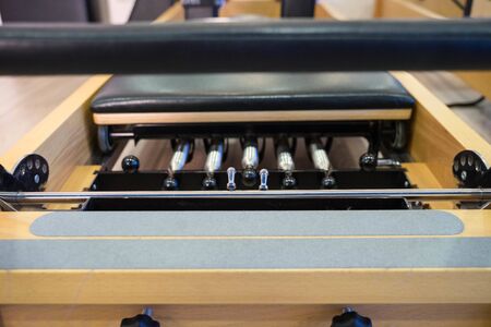 Man practicing kneeling stretch on pilates reformer with assistance to improve flexibility and strength. Trainer assist student doing lunge stretch on the reformer for enhancing balance. Habituate.