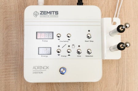 Ivano-Frankivsk, Ukraine December 20, 2022: Zemits microcurrent therapy device for skin tightening, cosmetologist's office and equipment.