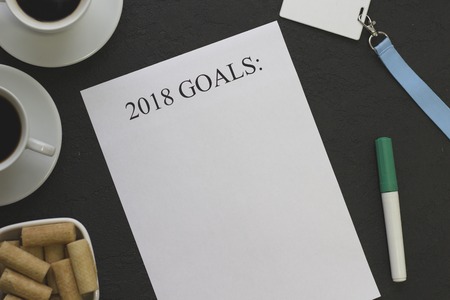 2018 goals paper,two coffee cups with saucers, a bowl of cookies and office supplies