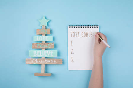Woman writing in notebook goals plans wish list for new year 2020, flat lay