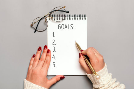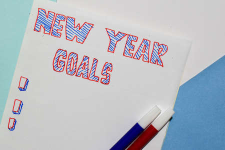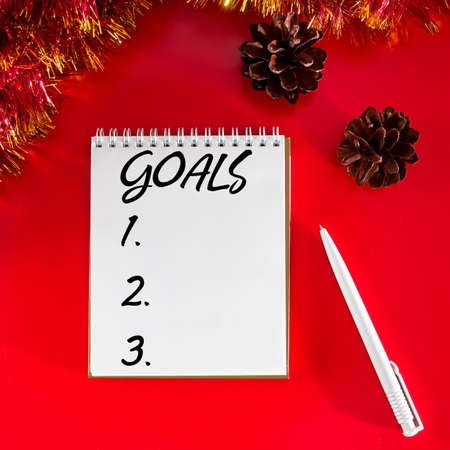 Goals in notepad lettering with red paints. Place for your text. The concept of goals in painting. Case planning. Happy New Year, Merry Christmas. Education motivation,inspiration. Top view, flat lay