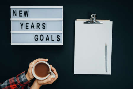 Womans hand with cocoa and Board with GOALS text, notebook, pencil on black background, top view, flat lay