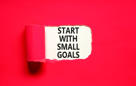 Start with small goals symbol. Concept words phrase Start with small goals on beautiful white paper. Beautiful red paper background. Business Start with small goals concept. Copy space.