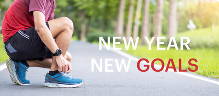 New Year New GOALS with Young man tying shoelace in the park outdoor, athlete runner man ready for running and jogging in morning. Fitness, wellness, healthy lifestyle and New You concepts