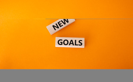 New goals symbol. Wooden blocks with words New goals. Beautiful orange background. Business and New goals concept. copyspace.