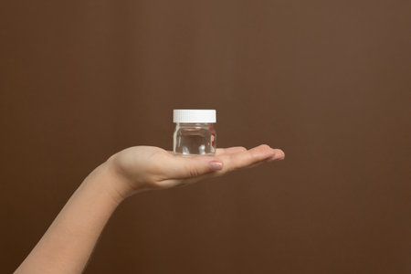 Hand presenting a small clear glass jar with a white cap against a brown background