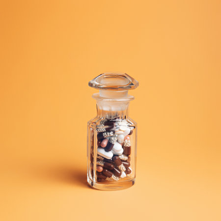 Bottle with pills and tablets on pastel old gold background. Minimal medicine layout.
