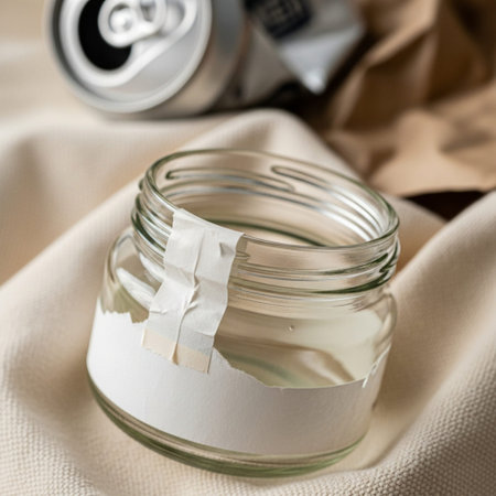An empty glass jar with a blank white label sits on a gray surface illuminated by natural light, creating shadows and a calm, minimalist atmosphere suitable for product display or health and wellness marketing.
