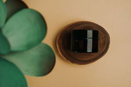 Closeup shot of skin care product's container on a cut tree log as a beautiful background