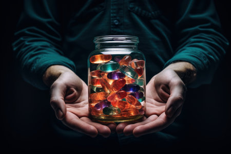 Portable Jar pills hands. Capsule container. Generate Ai