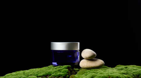round blue glass jar with lid for cosmetics stands on green moss, black background. Natural creams and masks. Product branding