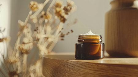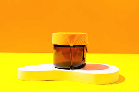 Mock-up of amber-colored glass jars for moisturizer on beige background in sunlight. Container with cosmetic products for face in close-up and with floral shadow.