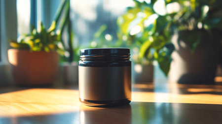 A canister for therapy is placed on a wooden surface in a sunlit room surrounded by potted plants, illustrating a serene environment ideal for relaxation and natural healing.