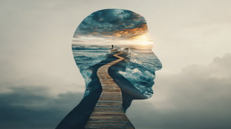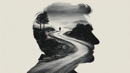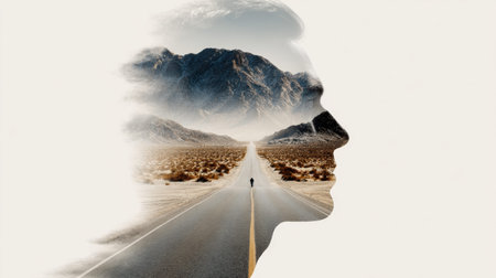 A human profile merges with an empty road stretching into mountains. The scene suggests a journey and exploration.