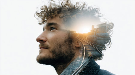 A man looks upward as his thoughts connect to distant train tracks and a bright horizon symbolizing choices and futures.