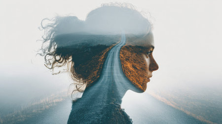 A human profile overlays a winding road creating an artistic vision that captures travel and exploration in one composition.