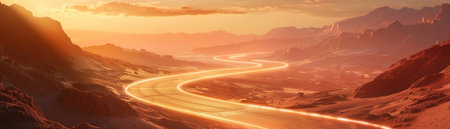 A conceptual artwork of a glowing road winding through a desert landscape at sunset.