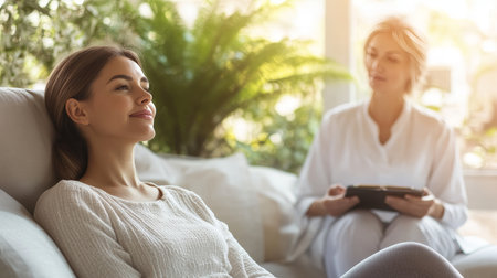 Serene Young Woman on Couch With Therapist, Mental Health Counseling, Taking Notes, Sunlit Room