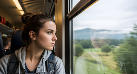 A pensive young woman with a backpack looks out the window during a train journey, her reflection visible in the glass. The passing landscape of trees and mountains suggests travel, contemplation, and the introspective nature of a solo trip.