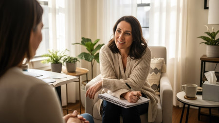 Two women are seated in a room, engaged in a conversation. One holds a clipboard and pen. The scene features warm lighting, soft textures, and a cozy atmosphere with neutral colors. The image could be used for articles, websites, or promotional material related to mental health or therapeutic services.