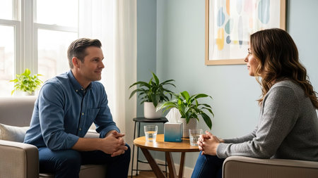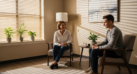 An image displays two individuals engaged in conversation within a warmly lit interior. The scene features a therapist and patient seated in comfortable chairs near a window, suggesting a counseling environment. The composition includes neutral colors, soft lighting, and an overall sense of calm. The image could be suitable for editorial and commercial applications.