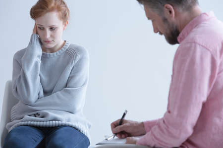 Woman patient with male psychologist consulting and doing psychotherapy with doctor in clinic. Psychiatrist concept