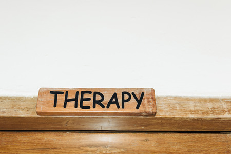A card displays the word Therapy, surrounded by medication. The setup features a syringe, red capsules and white pills scattered around the card on a clean, light surface.