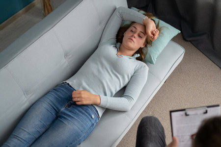 Psychologist listening to young depressed female patient lying on sofa and writing notes, mental health and counseling. Psychological treatment concept.