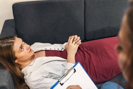 Psychotherapist session. Young woman talks about her depression and mental problems with psychologist counselor while lying in sofa, toned