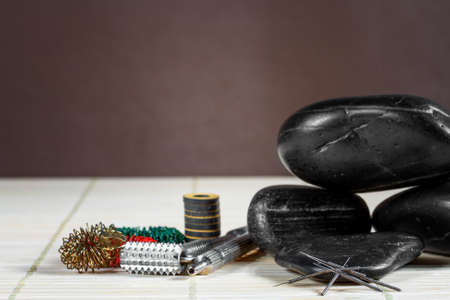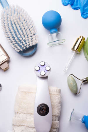 set of different hardware equipment with vacuum jars, nephrite roll and massage brush. anti-age and anti-cellulite set for home skin care procedure. beauty concept