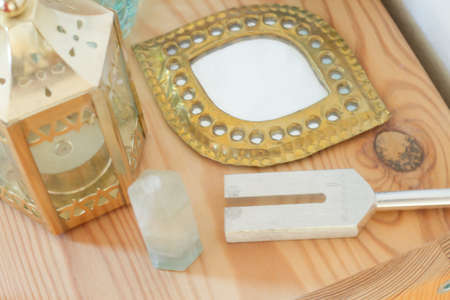 tuning fork and crystal on table .