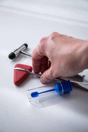 Female neurologist using reflex hammer and stool sample tube for multiple sclerosis research or examination