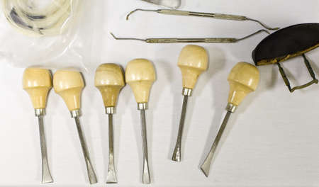 Dental instruments for stomatology practice. Tweezer, carver, wiper, drill, pincers, scraper, remover.