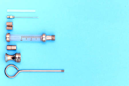 antique syringe disassembled into details on blue background