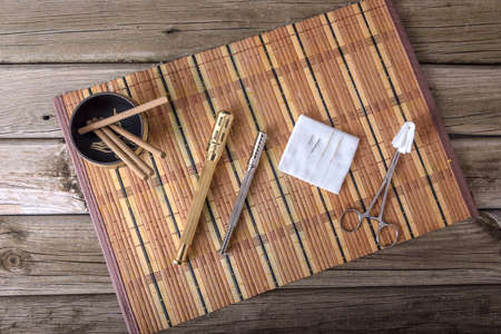 Alternative therapist applying moxibustion a traditional chinese medicine method. Doctor healing young patient with traditional asian medicine. Moxa stick alone. Extreme close up. Moxibustion.