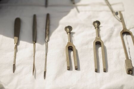 old medical instruments on tray in doctors office