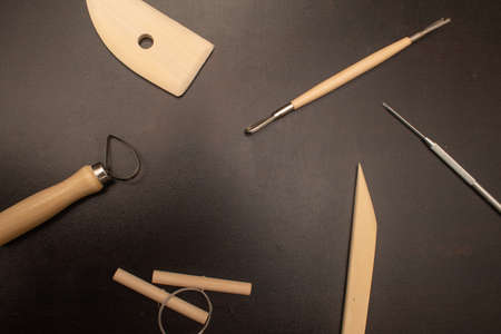 tools for sculpting clay, on a wooden table