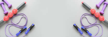 Sports equipment on gray background with space for text