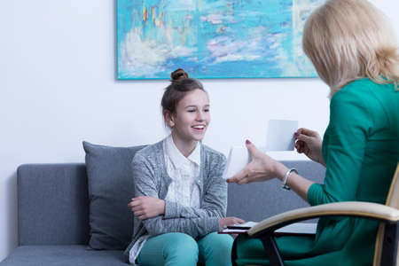 Tired sad teen girl resting on the couch during a therapy session to get help and advice for her mental health