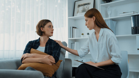 Woman patient with male psychologist consulting and doing psychotherapy with doctor in clinic. Psychiatrist concept