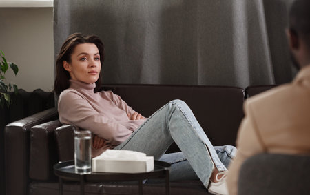 Photo of thoughtful caucasian woman having conversation with psychologist on therapy session in room