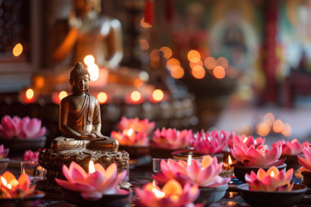 buddha statue, candles and lotus flowers for vesak day