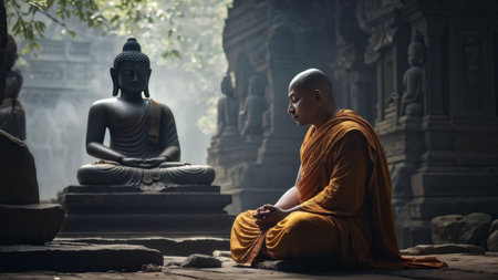 Serene practice - buddhism with buddhist monk meditating, highlighting peacefulness and spiritual depth of meditation, emphasizing importance of mindfulness, inner tranquility in buddhist tradition