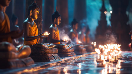 This enchanting image features Buddha statues surrounded by soft candlelight, creating a peaceful and reflective atmosphere, perfect for themes of spirituality and meditation.