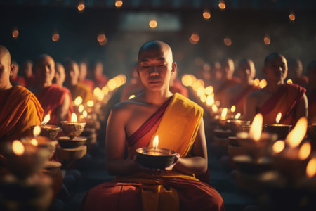 A group of monks sitting in front of lit candles. This image captures the peaceful and serene atmosphere of a religious ceremony. Ideal for illustrating spirituality and meditation practices.